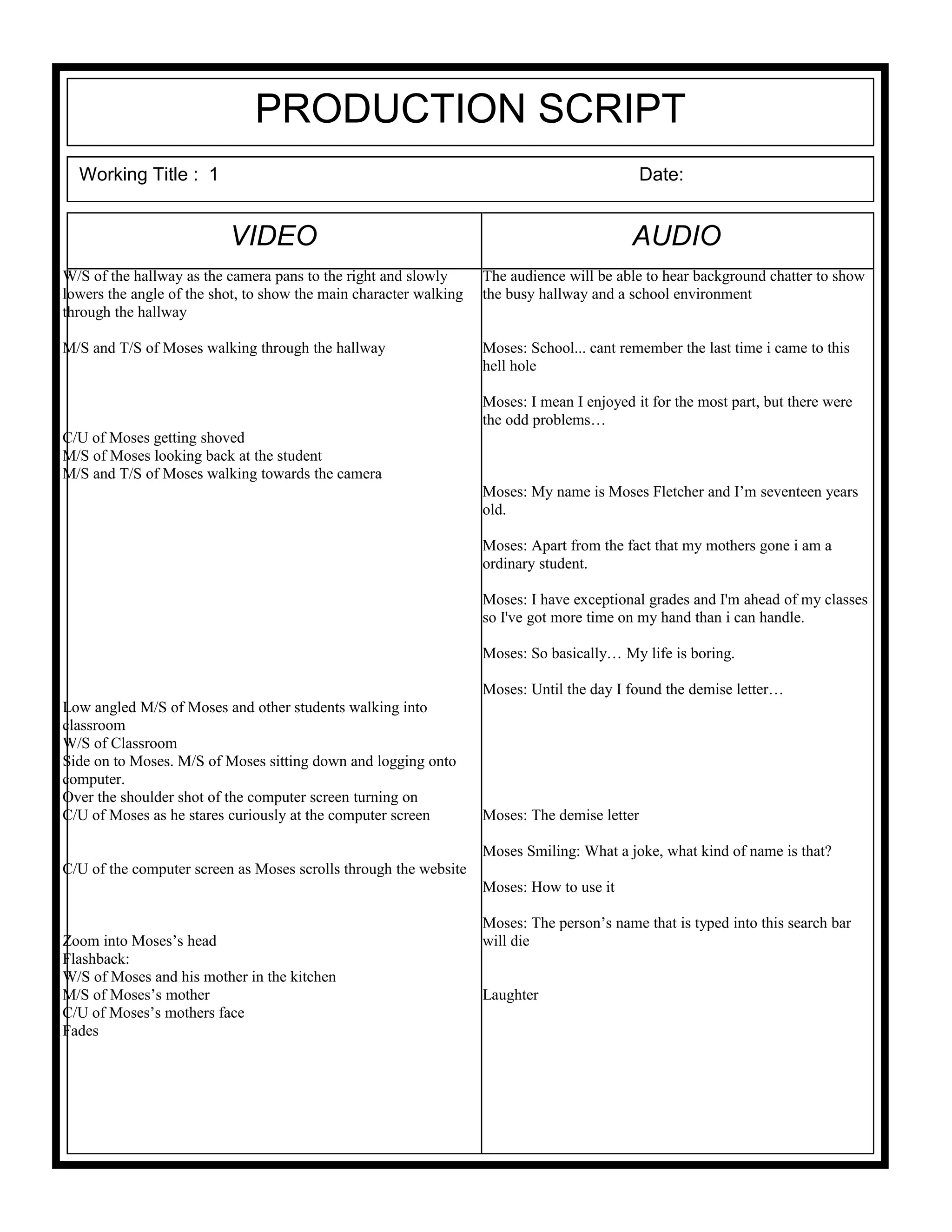 This document is a production script that outlines various camera shots and angles that will be used to film a scene. It follows the main character Moses as he walks through a school hallway where he is shoved by another student. In class, Moses logs onto a computer and curiously scrolls through a website. There is then a flashback that shows Moses and his mother in the kitchen. The script provides direction for establishing shots of the hallway and classroom, as well as close-up shots of Moses reacting to being shoved and exploring the mysterious website he finds.
