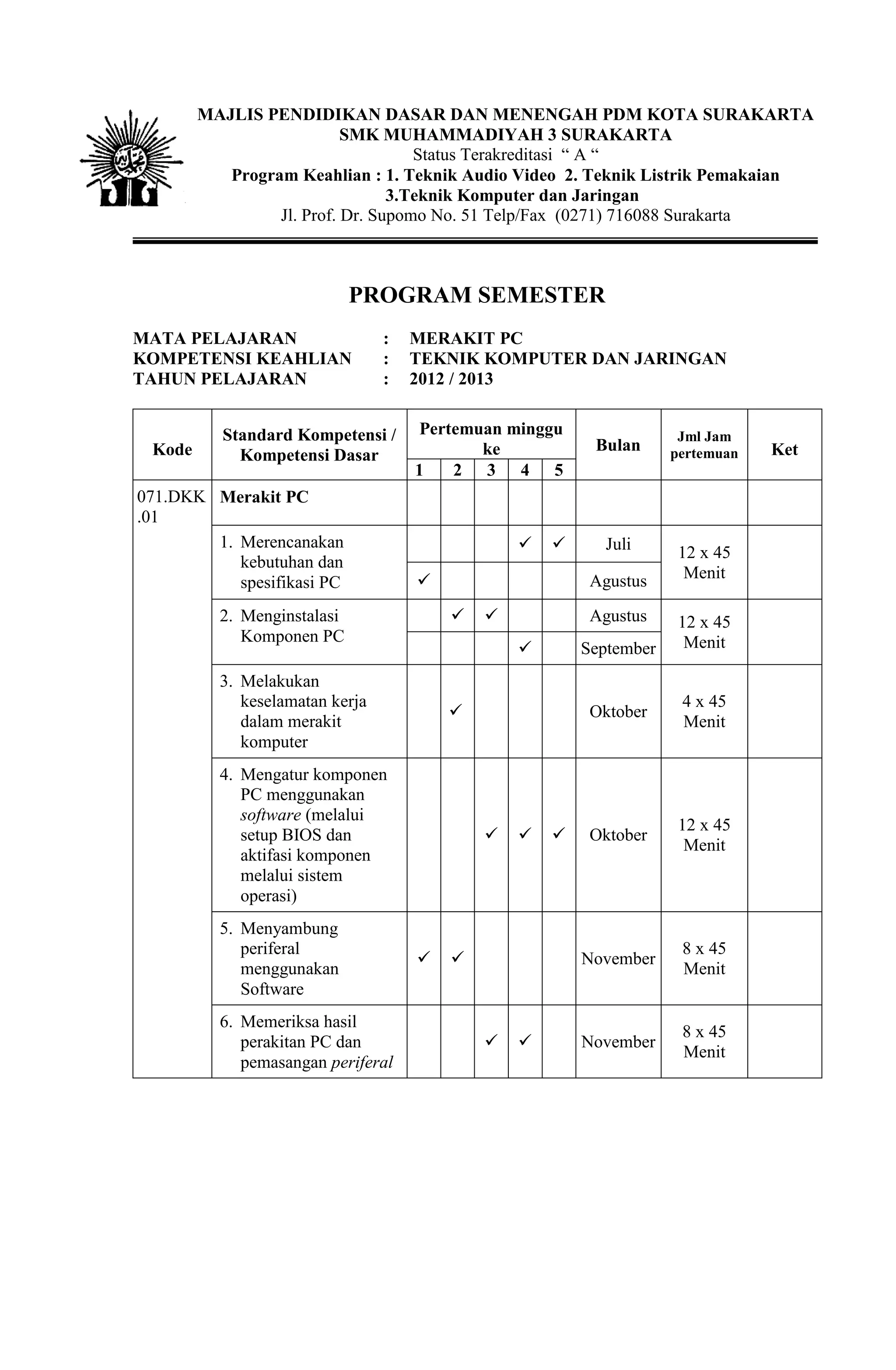 SMK Muhammadiyah 3 Surakarta adalah lembaga pendidikan terakreditasi 'A' yang menawarkan program keahlian dalam teknik audio video, listrik pemakaian, serta komputer dan jaringan. Kurikulum mencakup kompetensi merakit PC, dengan berbagai sesi pelatihan mulai dari perencanaan hingga pengujian hasil perakitan. Tahun pelajaran yang tercantum adalah 2012/2013, di bawah pengawasan kepala sekolah Drs. Edy Siyamto.