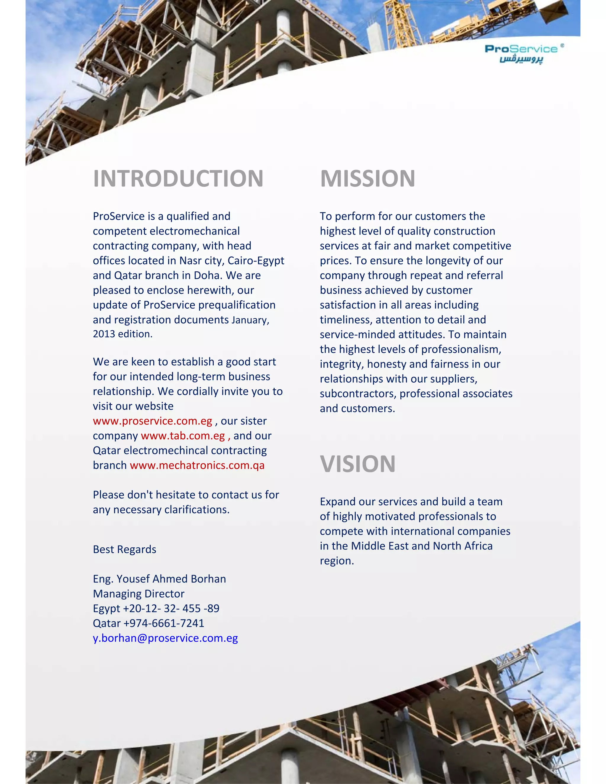Proservice is a qualified electromechanical contracting company operating in Egypt and Qatar, aiming to establish long-term business relationships while maintaining high standards of quality and professionalism. The document outlines the company's mission, vision, departments, and previously awarded projects in both countries. It includes details on their expertise in mechanical, electrical, and plumbing services, as well as registration documentation for business operations.