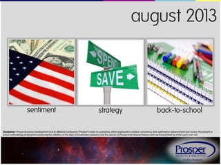 The document summarizes consumer sentiment and spending trends in August 2013 based on a monthly consumer survey. It finds that economic confidence weakened slightly from July, though remains higher than a year ago. While practical purchasing attitudes declined a bit from July, consumers continue to focus on necessities over wants when shopping. Planned back-to-school spending is projected to drop around $50 from 2012 but remains above recession levels.