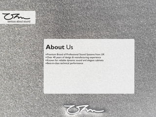 Pro Sound Systems is a UK-based brand with over 40 years of experience in designing and manufacturing high-quality professional sound systems known for their reliability and technical performance. Their product range includes solutions for various applications such as places of worship, cafes, and live events, offering background and main systems, subwoofers, ceiling speakers, and portable solutions with an emphasis on sound clarity and efficient design. The company caters to both commercial and live sound needs, providing a wide array of customizable options for optimal sound performance.