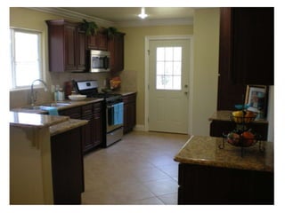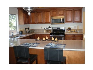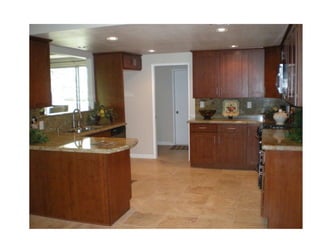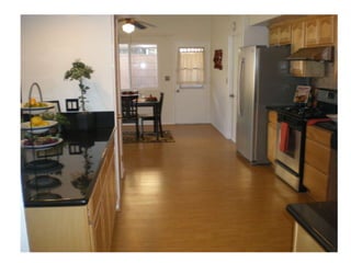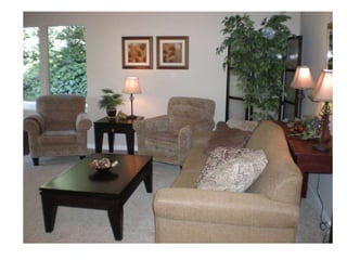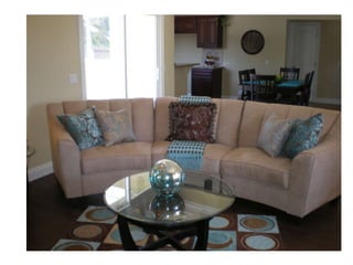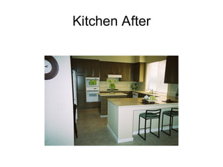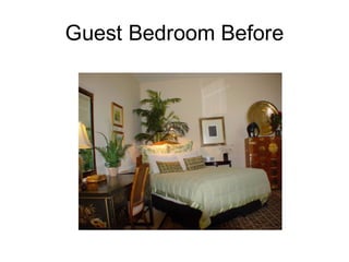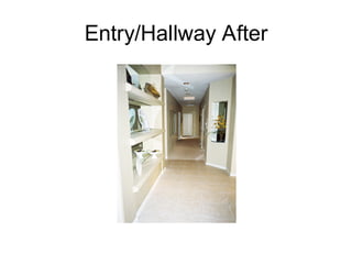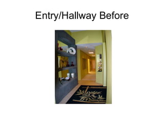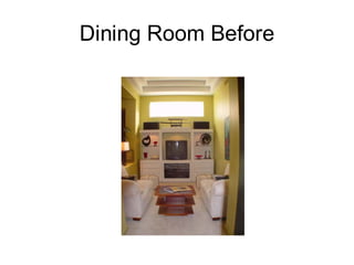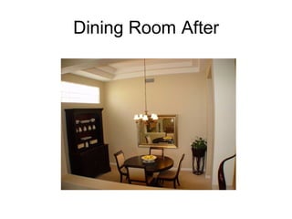 This document shows before and after photos of various rooms in a home that have been staged, including family rooms, living rooms, kitchens, bathrooms, bedrooms, and dining areas. Photos are presented side by side to demonstrate how professional staging transformed each space making them more appealing to potential buyers.