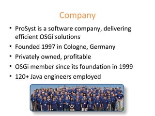 ProSyst is a software company founded in 1997 that delivers OSGi solutions. It has 120+ Java engineers and targets embedded devices and enterprise software. ProSyst developed an application server that was acquired by SAP and has additional reference customers. It is actively involved in driving OSGi specifications and reference implementations and provides consulting, training, and development services using its staff of OSGi experts.