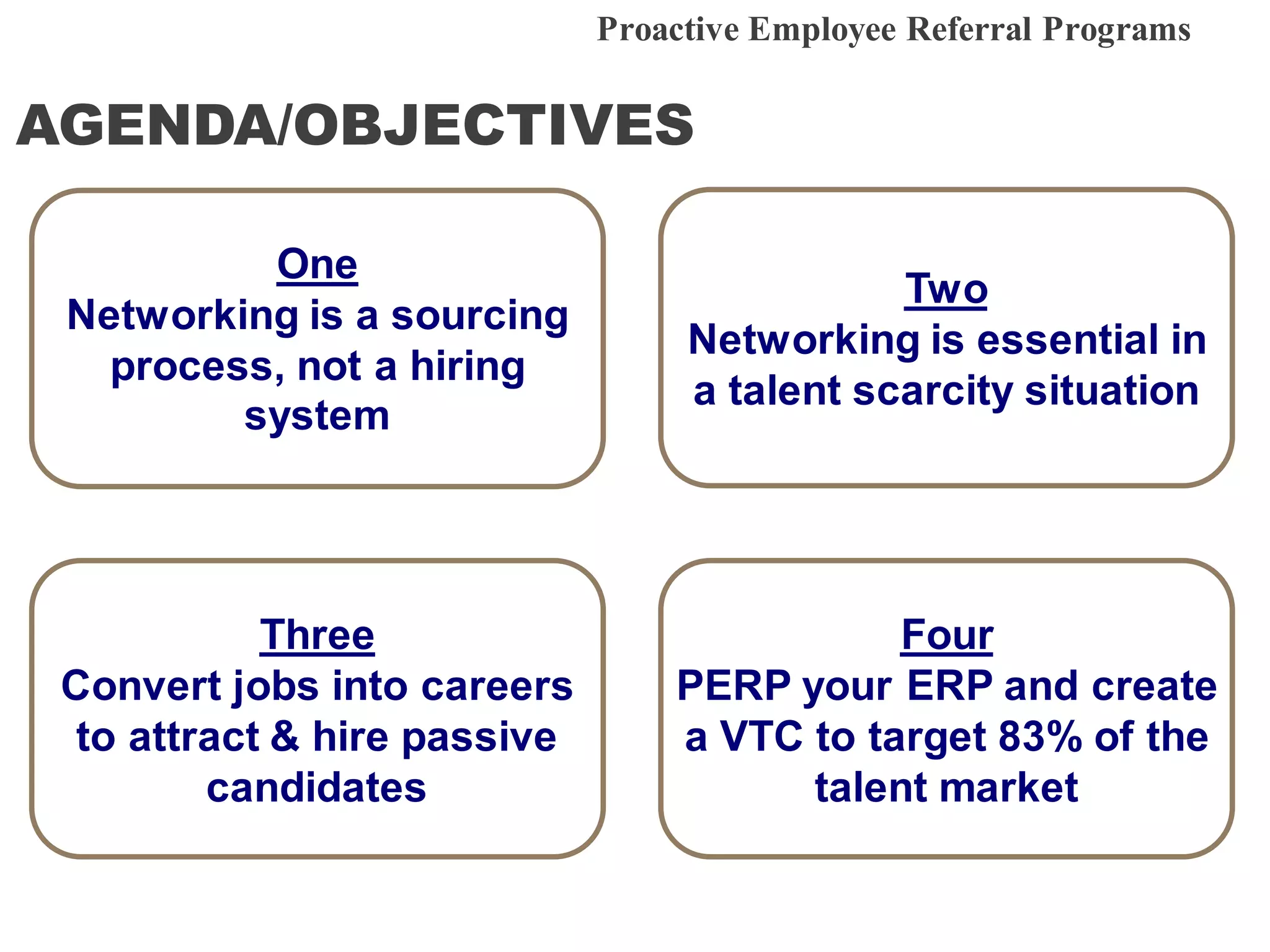 This document outlines a strategy for attracting and hiring passive candidates through proactive employee referral programs (PERP). It discusses: