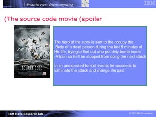 Proactive event-driven computing is a new paradigm that aims to take proactive actions based on forecasted events before problems occur. It involves detecting events, forecasting future events, making real-time decisions, and taking proactive actions. The document discusses challenges in creating proactive solutions and outlines key aspects of proactive computing including uncertainty handling, real-time decision making under uncertainty, and learning patterns and causal relationships.