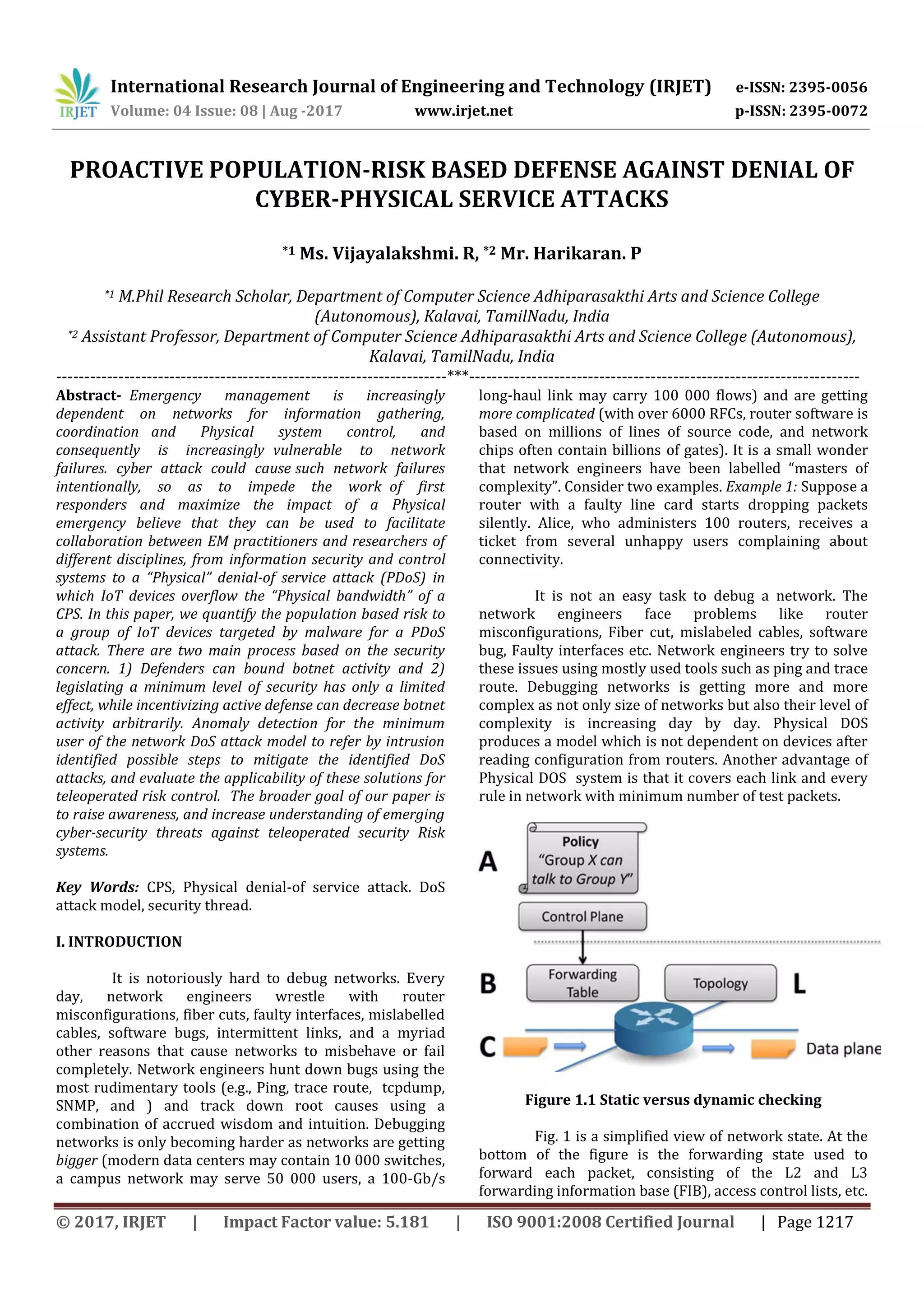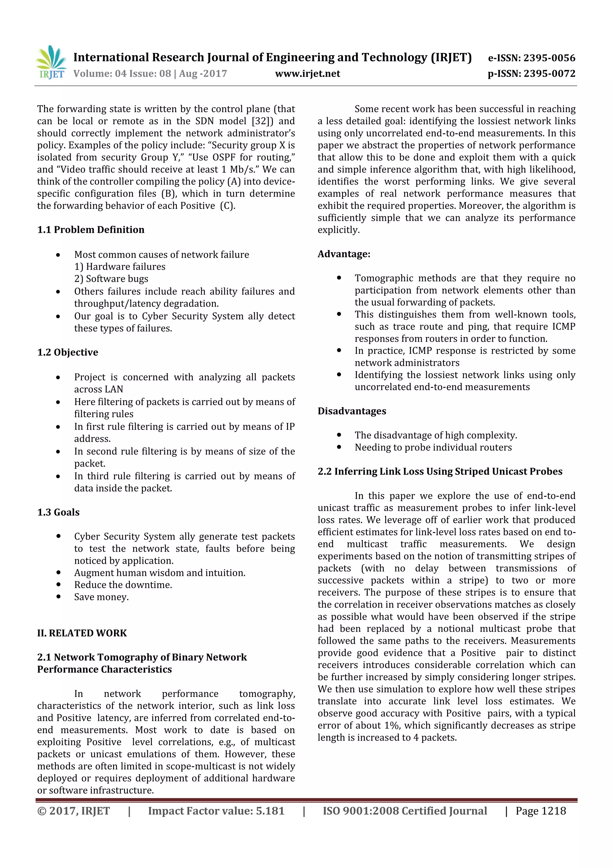 This document discusses proactive population-risk based defense against denial of cyber-physical service attacks. It proposes using test packets to test network state and rules across switches to detect faults. The goals are to augment human debugging, reduce downtime, and save money. Related work discussed network tomography using end-to-end measurements to identify lossy links. Striped unicast probes were also explored to infer link-level loss rates. The algorithm aims to generate test packets that exercise every rule on each switch to detect faults with a minimum number of packets.