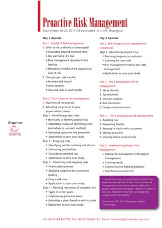 The document announces a two-day workshop on proactive risk management to be held in Shanghai from September 28-29, 2011. The workshop will provide hands-on experience applying a risk management process, allow practice of specific risk management skills, and share supplementary information and tools. It will be led by Preston Smith, an expert in rapid product development methods with over 20 years of experience consulting globally.