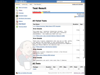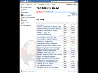 The document discusses using YSlow, a web performance optimization tool, in a continuous integration (CI) workflow. It provides examples of running YSlow from the command line and integrating YSlow with a Node.js server to analyze HAR files from a CI system. Running YSlow as part of CI allows catching performance regressions earlier by comparing performance across branches. The best practice shown is combining real user monitoring (RUM) data with YSlow and other tools like WebPageTest to monitor production performance and catch issues.