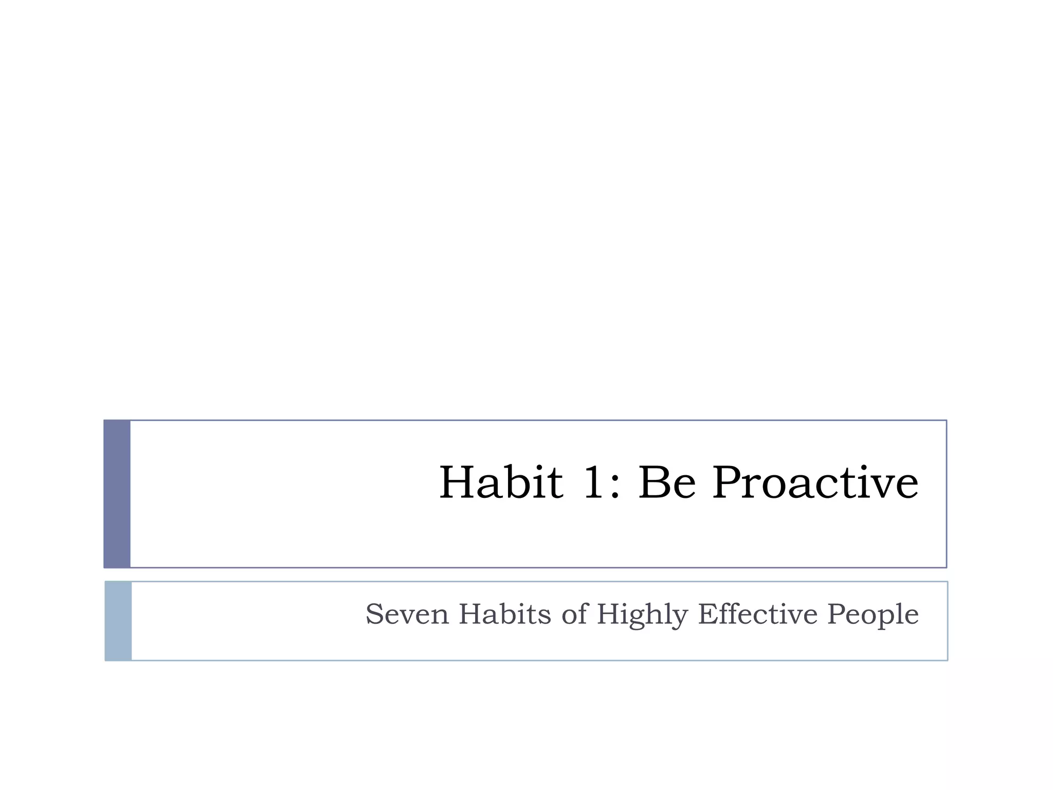 Habit 1 discusses being proactive. It explains that proactive people make things happen through their own decisions and choices rather than blaming outside conditions. They are responsible for their own behavior and response to situations. Reactive people on the other hand blame outside factors for their behavior and build their lives around other people's emotions. The document emphasizes that we have freedom to choose our response and that what matters most is how we respond to what happens in life. It encourages taking initiative to act rather than be acted upon.