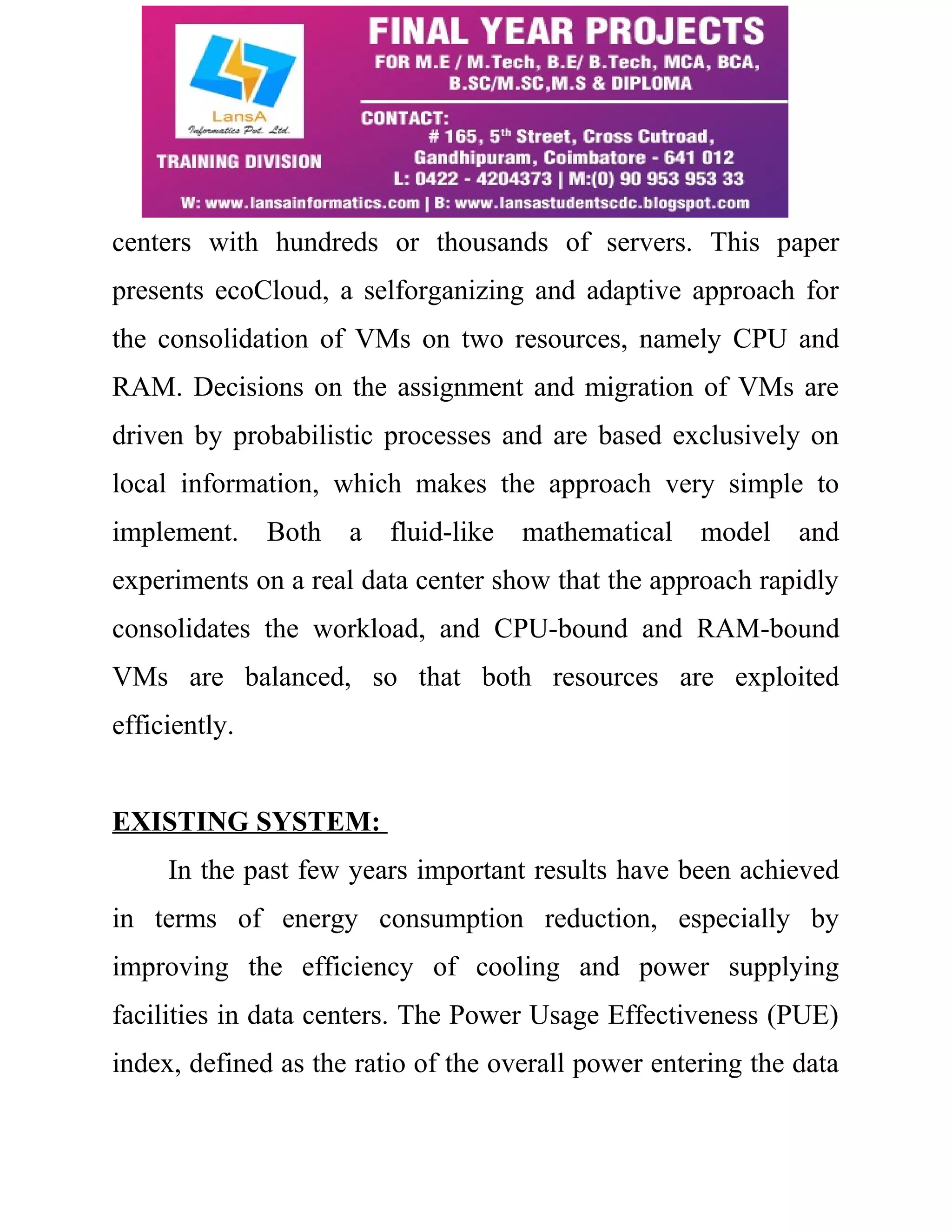 The document discusses 'EcoCloud', a self-organizing approach for consolidating virtual machines (VMs) in cloud data centers to enhance power efficiency by balancing CPU and RAM usage. It utilizes probabilistic processes for VM assignment and migration based on local information, which allows for effective workload consolidation while minimizing energy consumption. The proposed system shows significant improvements in resource utilization and power savings, addressing the challenges posed by low server utilization rates in modern data centers.
