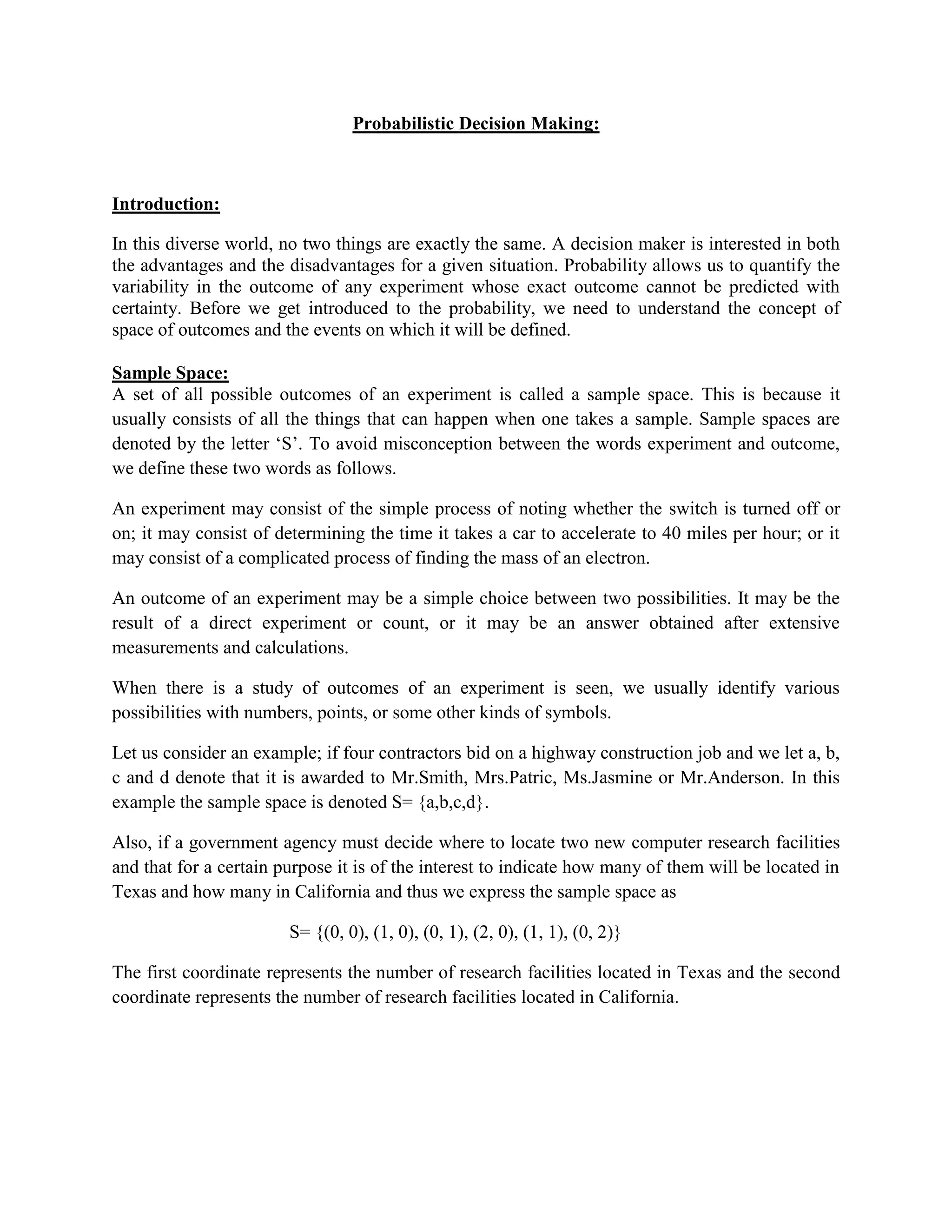 The document discusses probabilistic decision making and the role of emotions in decision making. It defines key probability concepts like sample space, classical probability theory, and conditional probability. It explains that emotions can both help and hinder decision making - emotions may lead to faster decisions in some cases but also cause problems like procrastination. The document argues that removing emotions from decision making can allow for more optimal decisions by avoiding issues like sub-optimal intertemporal choices due to self-control problems.