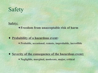 This document discusses probabilistic risk assessment and factors that influence risk tolerance. It addresses the classification of probability and severity of hazardous events. It also examines different types of risks, including voluntary and involuntary risks. Mortality rates from various causes such as accidents, diseases, and natural hazards are presented to illustrate perceptions of risk tolerance.