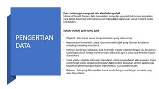 Dokumen ini membahas pengertian data, sampling, dan populasi dalam konteks probabilitas dan statistika. Ini menjelaskan syarat-syarat data yang baik, jenis-jenis data serta metode pengumpulan data, serta teknik pengambilan sampel. Ditekankan pentingnya ukuran sampel dan faktor-faktor yang mempengaruhi dalam penelitian untuk mendapatkan hasil yang akurat dan representatif.