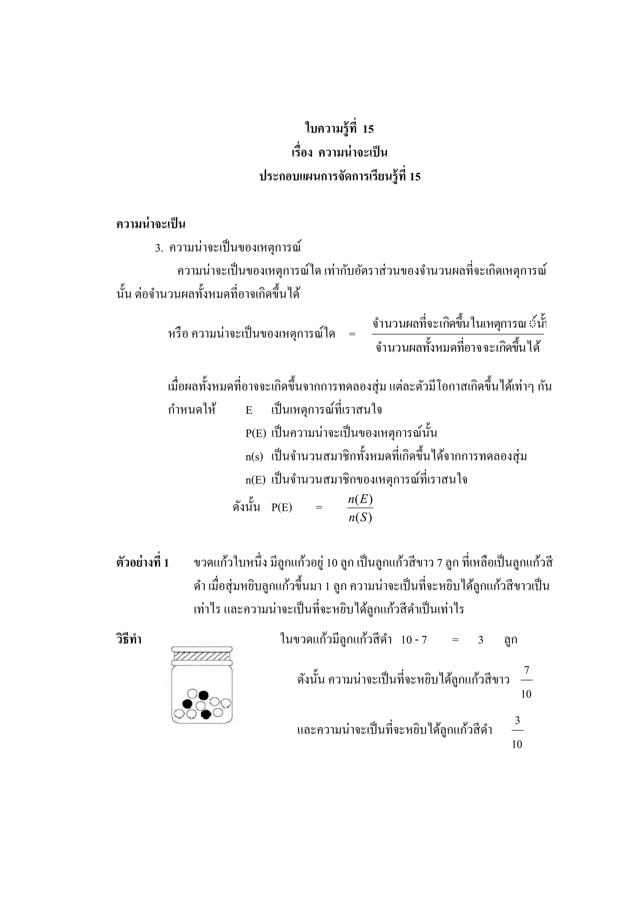 เรื่อง ความน่ าจะเป็ น ประกอบแผนการจัดการเรียนรู้ ที่ 15 ความน่ าจะเป็ น 3. ความน่าจะเป็ นของเหตุการณ์ ความน่าจะเป็ นของเหตุการณ์ใด เท่ากับอัตราส่ วนของจานวนผลที่จะเกิดเหตุการณ์ นั้น ต่อจานวนผลทั้งหมดที่อาจเกิดขึ้นได้ จานวนผลทีจะเกิดขึ้นในเหตุการณ ์์น้น ่ ั หรื อ ความน่าจะเป็ นของเหตุการณ์ใด = จานวนผลทั้งหมดทีอาจ จะเกิดขึ้นได้ ่ เมื่อผลทั้งหมดที่อาจจะเกิดขึ้นจากการทดลองสุ่ ม แต่ละตัวมีโอกาสเกิดขึ้นได้เท่าๆ กัน กาหนดให้ E เป็ นเหตุการณ์ที่เราสนใจ P(E) เป็ นความน่าจะเป็ นของเหตุการณ์น้ น ั n(s) เป็ นจานวนสมาชิกทั้งหมดที่เกิดขึ้นได้จากการทดลองสุ่ ม n(E) เป็ นจานวนสมาชิกของเหตุการณ์ที่เราสนใจ n( E ) ดังนั้น P(E) = n( S ) ตัวอย่างที่ 1 ขวดแก้วใบหนึ่ง มีลูกแก้วอยู่ 10 ลูก เป็ นลูกแก้วสี ขาว 7 ลูก ที่เหลือเป็ นลูกแก้วสี ดา เมื่อสุ่ มหยิบลูกแก้วขึ้นมา 1 ลูก ความน่าจะเป็ นที่จะหยิบได้ลูกแก้วสี ขาวเป็ น เท่าไร และความน่าจะเป็ นที่จะหยิบได้ลูกแก้วสี ดาเป็ นเท่าไร วิธีทา ในขวดแก้วมีลูกแก้วสี ดา 10 - 7 = 3 ลูก 7 ดังนั้น ความน่าจะเป็ นที่จะหยิบได้ลูกแก้วสี ขาว 10 3 และความน่าจะเป็ นที่จะหยิบได้ลูกแก้วสี ดา 10