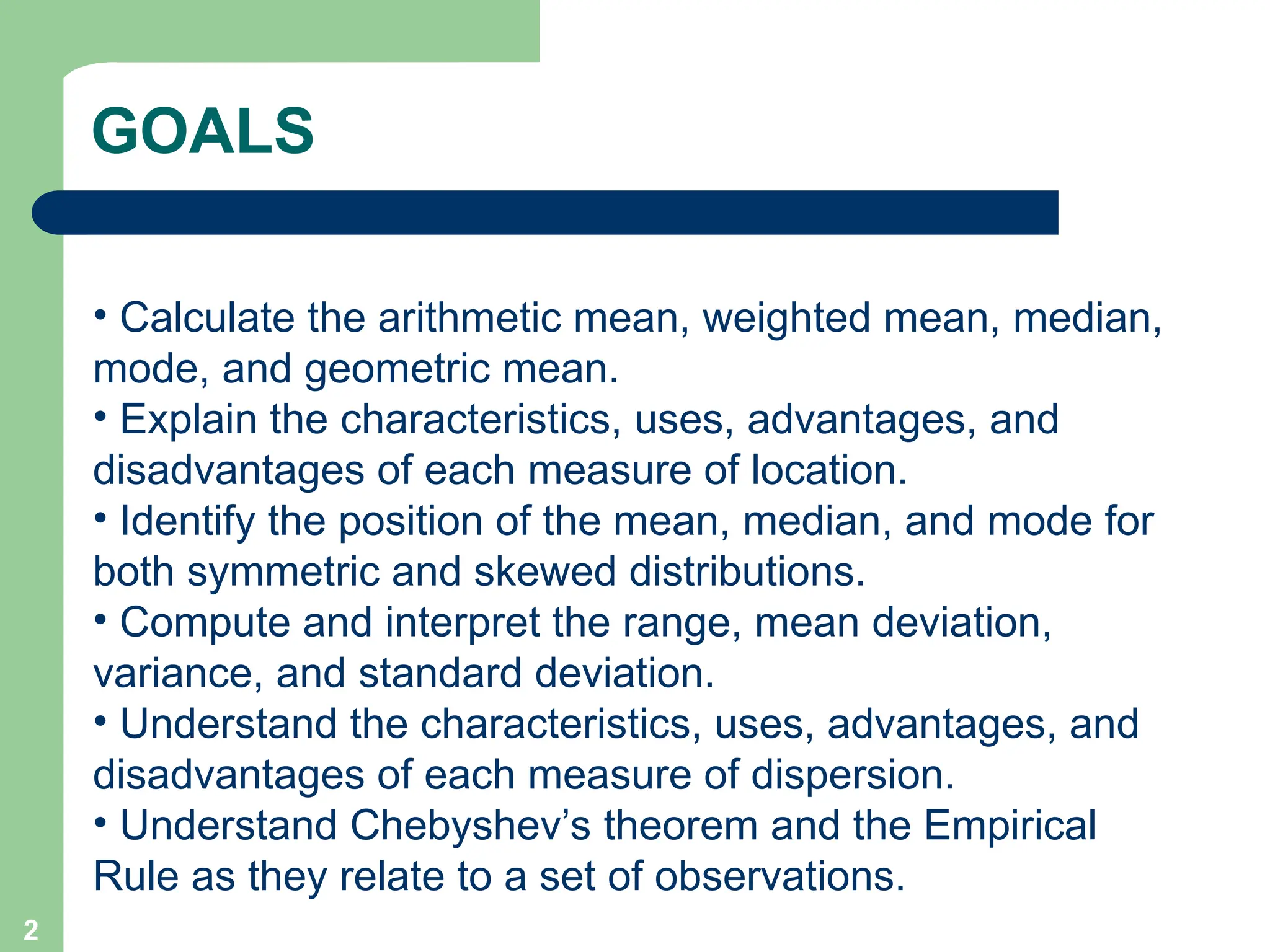 Chapter 3 focuses on descriptive statistics, including measures of central tendency like the mean, median, and mode, as well as measures of dispersion such as range, variance, and standard deviation. It also covers methods for calculating these measures and the implications of data distribution characteristics, including skewness. The chapter concludes with discussions on Chebyshev's theorem and the empirical rule related to data observations.