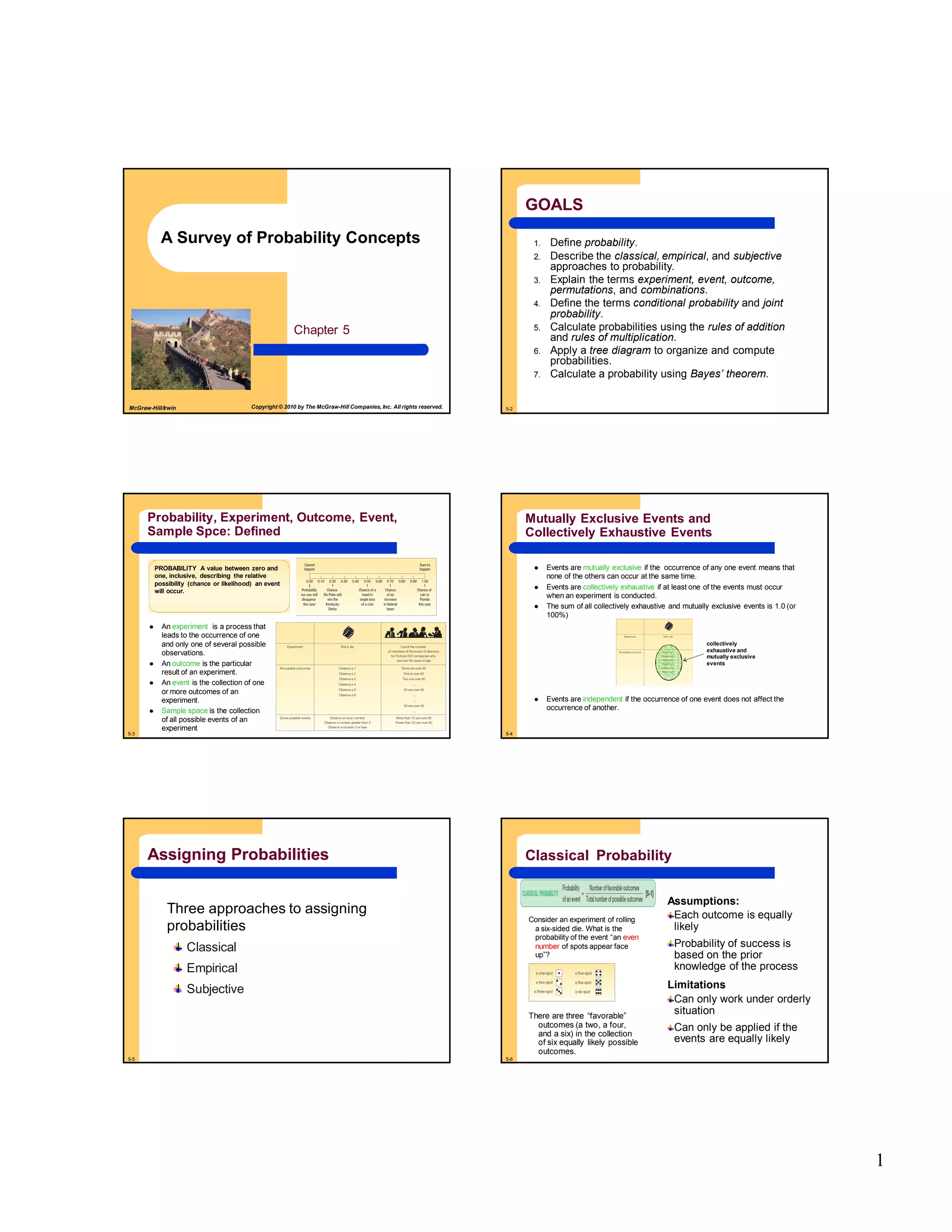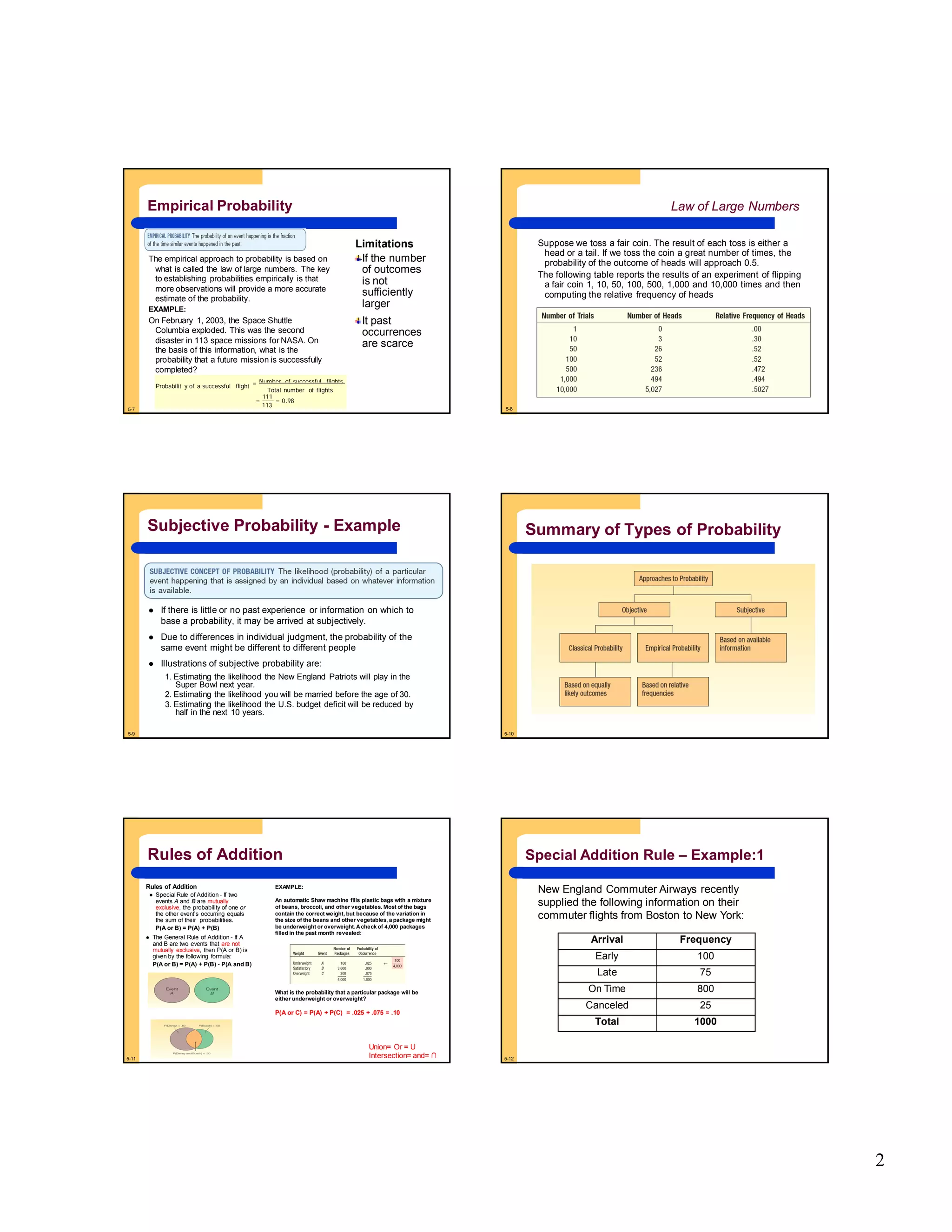 The document covers various concepts of probability, including definitions of key terms such as experiments, events, and outcomes. It explains different approaches to assigning probabilities: classical, empirical, and subjective, as well as addition and multiplication rules for calculating probabilities. Additionally, it discusses the complement rule and provides examples illustrating these concepts.