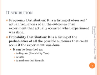 This document discusses different probability distributions including binomial, Poisson, and normal distributions. It provides examples and formulas for each distribution. The binomial distribution describes phenomena with two possible outcomes, like coin tosses. The Poisson distribution applies when there are many trials with low probability of success. The normal distribution is a continuous distribution that is symmetric and bell-shaped, commonly used to model natural phenomena.