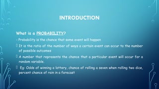 The document provides an introduction to probability, defining it as the chance of an event occurring, expressed as a ratio of favorable outcomes to total possible outcomes. It discusses key concepts such as random experiments, random variables, different types of events (like mutually exclusive and independent events), and probability distributions. Additionally, it contrasts objective and subjective approaches to probability assessment.