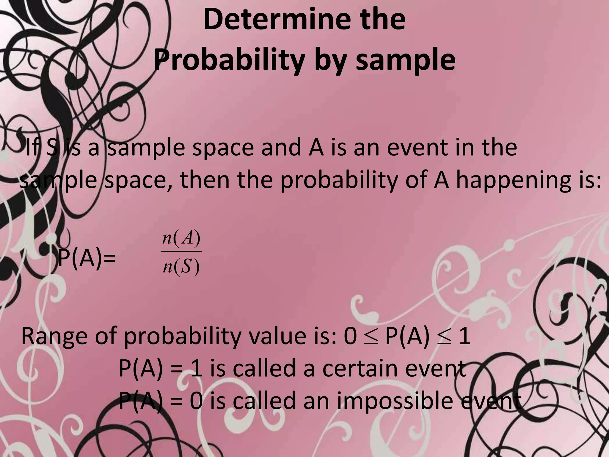 This document discusses probability and how it is calculated from a sample space. It provides the formula for calculating probability as the number of outcomes in the event divided by the total number of outcomes in the sample space. It gives examples of calculating probability when rolling a die and explains that probabilities range from 0 to 1, with 1 being a certain event and 0 being impossible. It also introduces the concept of expected frequency as the probability of an event occurring over many trials.