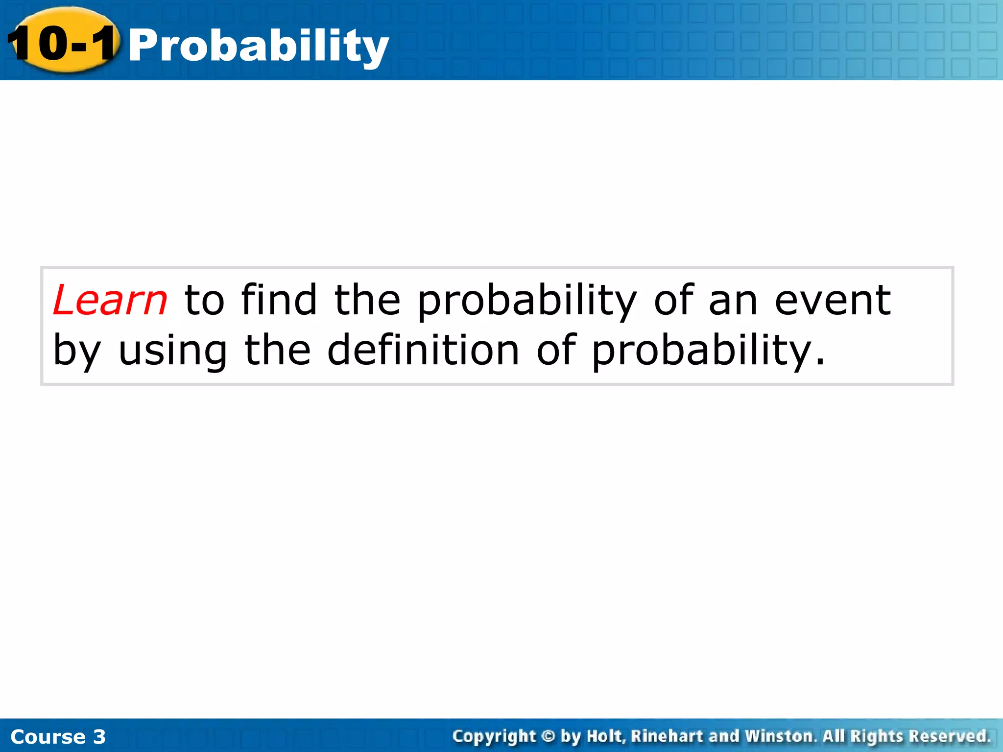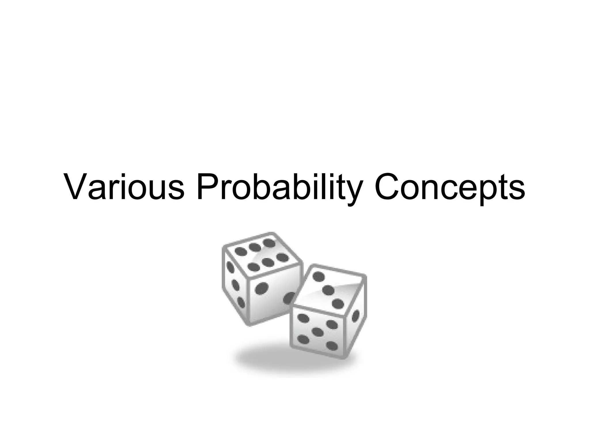 This document covers probability concepts including experiments, outcomes, sample spaces, events, and probabilities. It defines key terms and provides examples of calculating probabilities of outcomes and events using concepts like the fundamental counting principle and determining if events are independent or dependent. Sample problems are given throughout for practicing these probability concepts and determining the number of possible outcomes, finding individual outcome probabilities, and calculating probabilities of compound events.