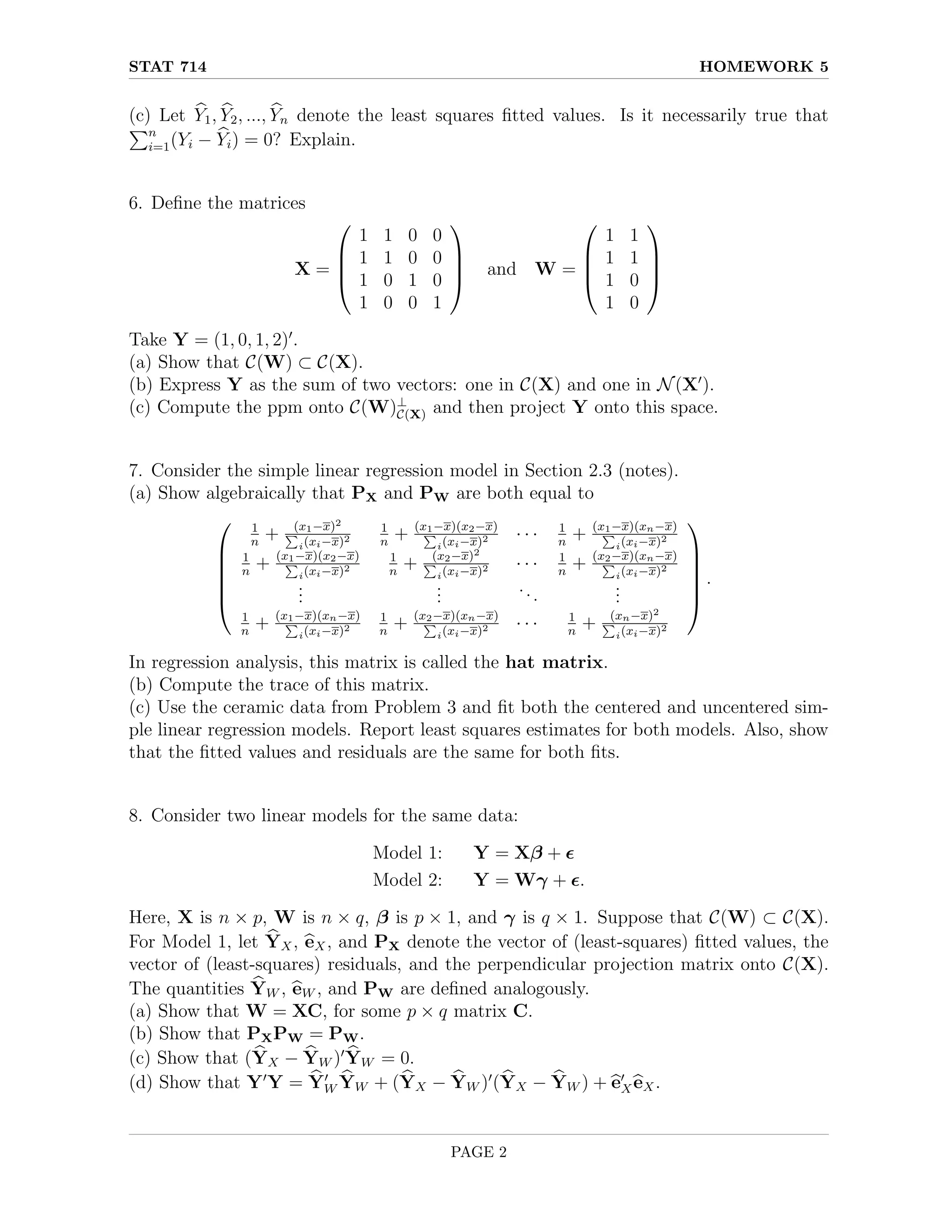 The document presents homework problems related to statistical models, particularly focusing on linear regression, least squares estimation, and projection matrices. It covers the general linear model, least squares estimators, experimental data analysis, and the properties of projection matrices in regression settings. The problems require deriving estimators, analyzing covariance structures, and understanding the implications of different model specifications.