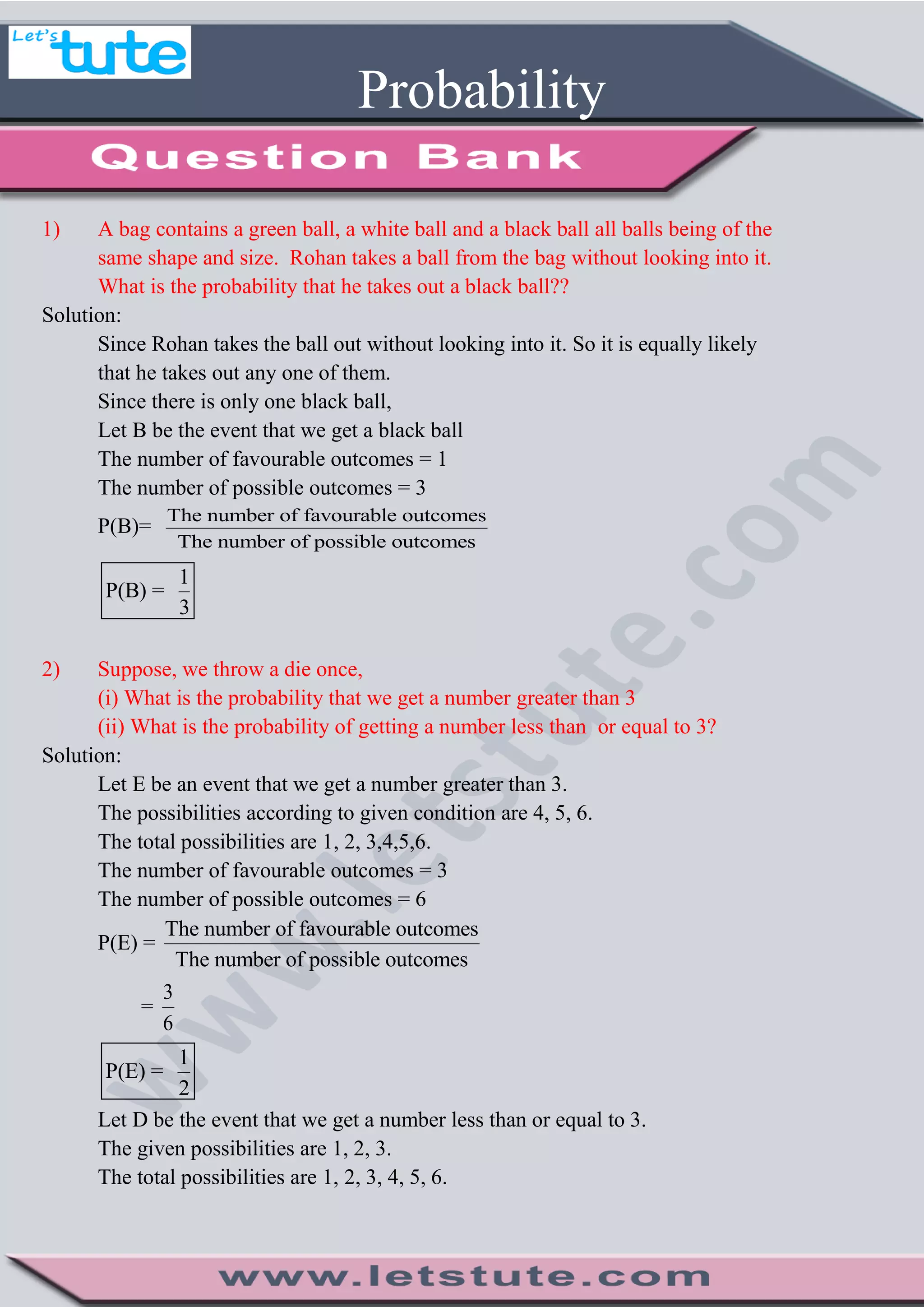 1) A bag contains balls of 3 colors. The probability of drawing a black ball is 1/3.