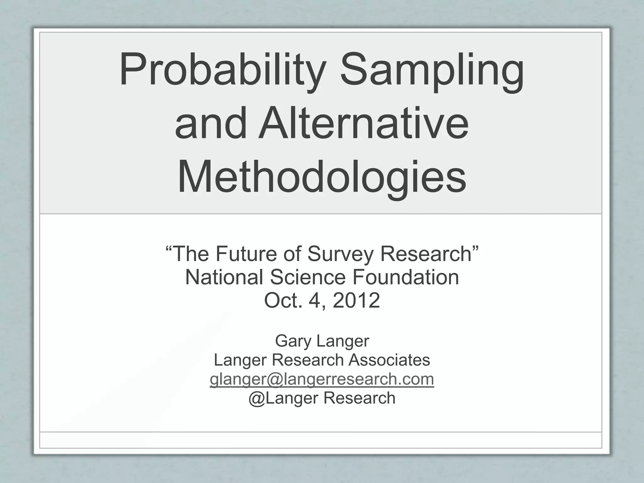 This document discusses the evolution of survey sampling methods, emphasizing the importance of probability sampling for reliable data collection and analysis. It contrasts traditional methods with newer opt-in online methodologies, highlighting the potential biases and inaccuracies associated with non-probability samples. The text concludes that probability sampling remains the gold standard for ensuring representative and accurate survey results.