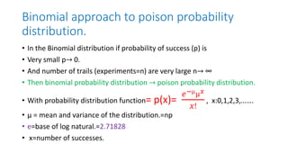 The Poisson distribution describes the number of events occurring in a fixed interval of time or space if these events occur with a known average rate and independently of the time since the last event. The document provides details about the Poisson distribution, including its properties and applications. It also provides an example derivation of the Poisson distribution as an approximation to the binomial distribution when the probability of success is very small and the number of trials is very large.