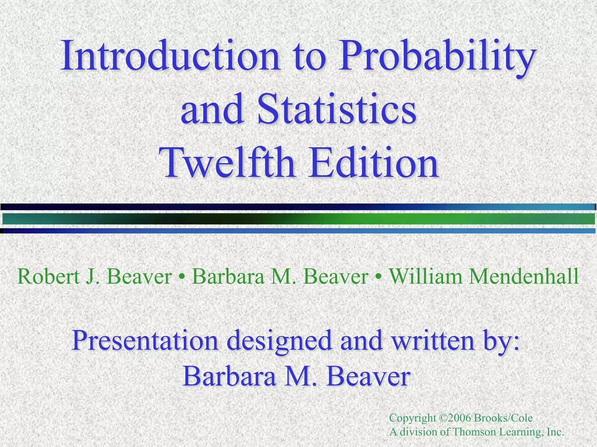 This document contains an excerpt from the 12th edition of the textbook "Introduction to Probability and Statistics" by Robert J. Beaver, Barbara M. Beaver, and William Mendenhall. The excerpt discusses basic concepts of probability, including experiments, simple events, sample spaces, events, mutually exclusive events, and how to calculate probabilities using counting rules and formulas. It provides examples such as tossing coins and selecting M&Ms to illustrate these probability concepts.