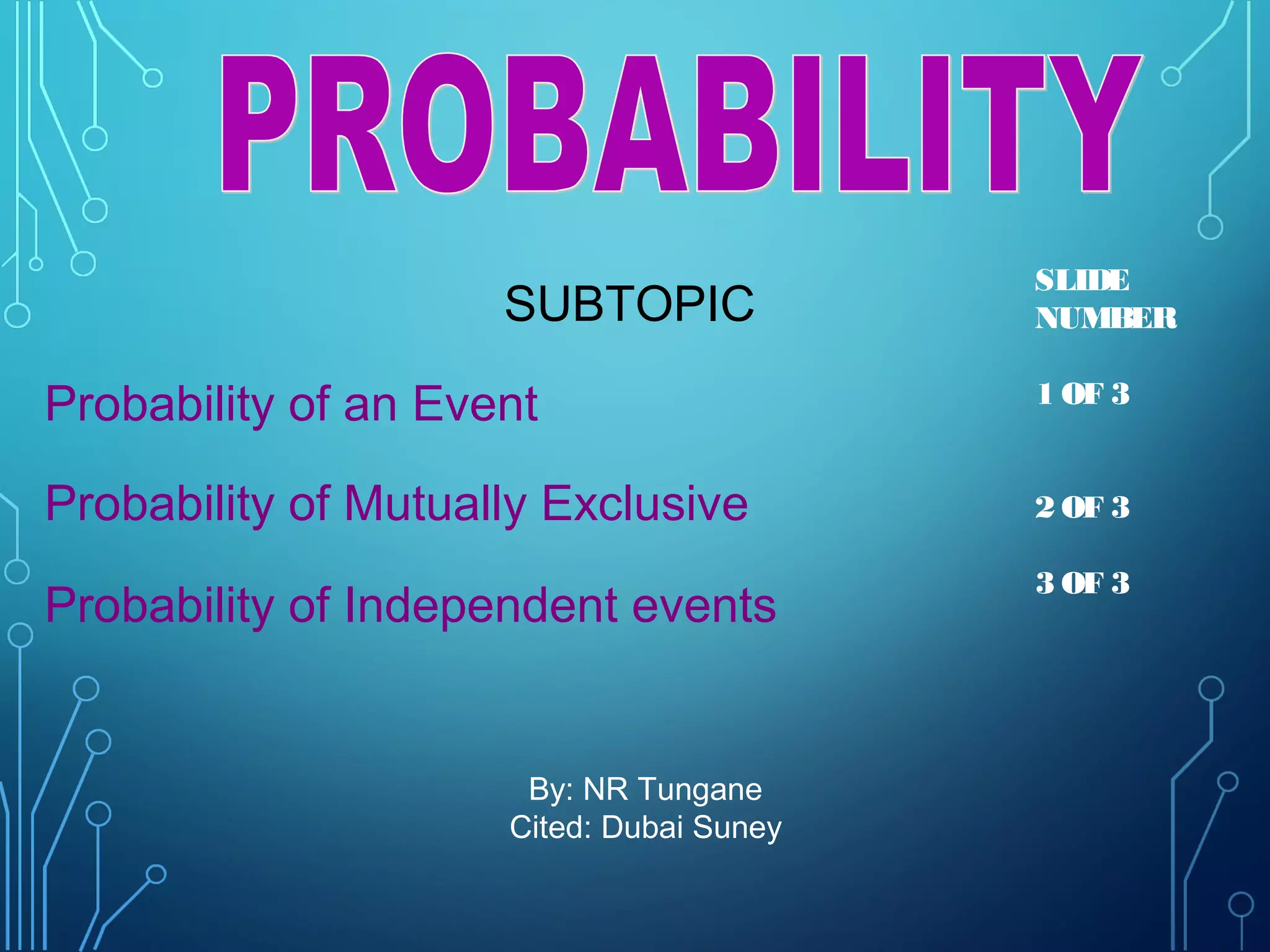 This document discusses three topics related to probability: 1) the probability of an event, which is defined as the number of desired outcomes divided by the total number of possible outcomes, 2) the probability of mutually exclusive events, which is the sum of the individual probabilities minus the probability of both occurring, and 3) the probability of independent events, which uses the multiplication rule and is the product of the individual probabilities if the events do not affect each other.
