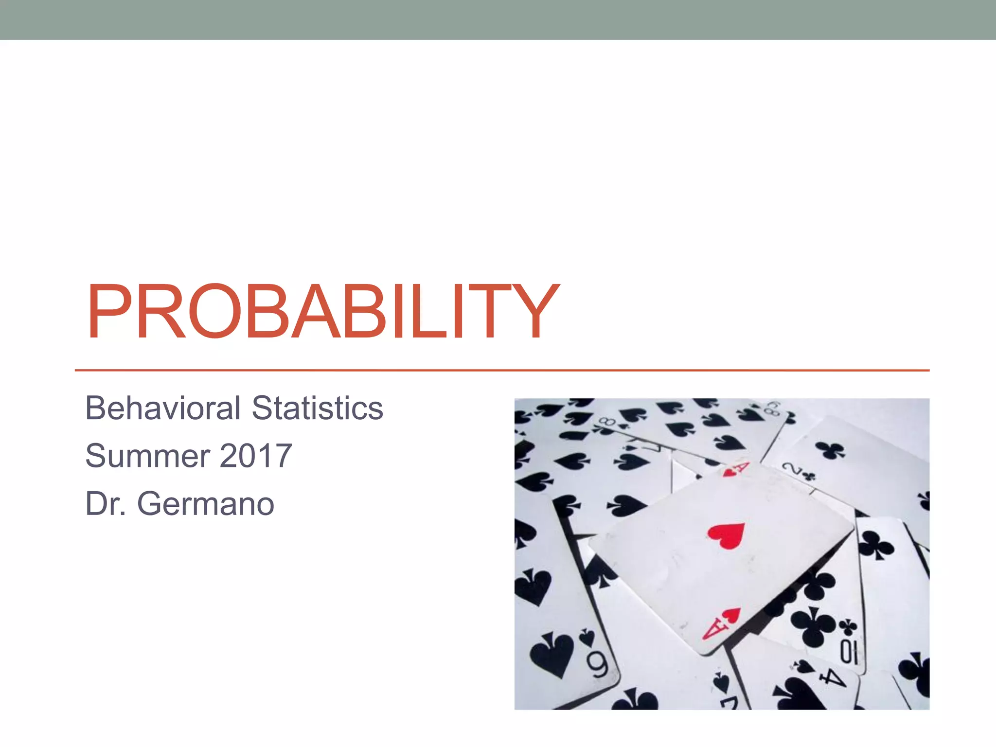 This document provides an overview of probability and how it relates to statistics. It defines probability as a method for quantifying the likelihood of outcomes. Probability is measured as a ratio of the number of desired outcomes to the total number of possible outcomes. For outcomes to have a known probability, they must be selected through a random process. The normal distribution is discussed as it relates to probability, with common probabilities and areas under the normal curve defined. The document shows how to calculate probabilities for raw scores on a normal distribution using z-scores. It also demonstrates finding probabilities for ranges of scores and finding z-scores from known proportions.