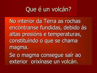 Que é unvolcán? No interior da Terra as rochas encóntranse fundidas, debido ás altas presións e temperaturas, constituíndo o que se chama magma. Se o magma consegue saír ao exterior orixínase un volcán.