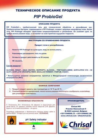 Pip Probiogel — пробиотический гель для дезинфекции рук, который способствует созданию здоровой микрофлоры кожи и обладает увлажняющими свойствами. Его следует наносить на сухие руки без использования воды и оставлять на 30 секунд для действия. Продукт требует хранения в определенных температурных условиях и имеет определенные меры безопасности при использовании.