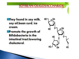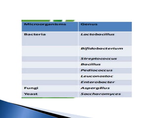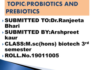 The document discusses probiotics and prebiotics. It defines probiotics as live microorganisms that provide health benefits when consumed, and defines prebiotics as nondigestible food ingredients that promote the growth of beneficial bacteria. Some key points covered include the history of probiotics and prebiotics; characteristics, functions and food sources of probiotics; common prebiotic fibers like inulin and their health benefits; and potential side effects of excessive intake.