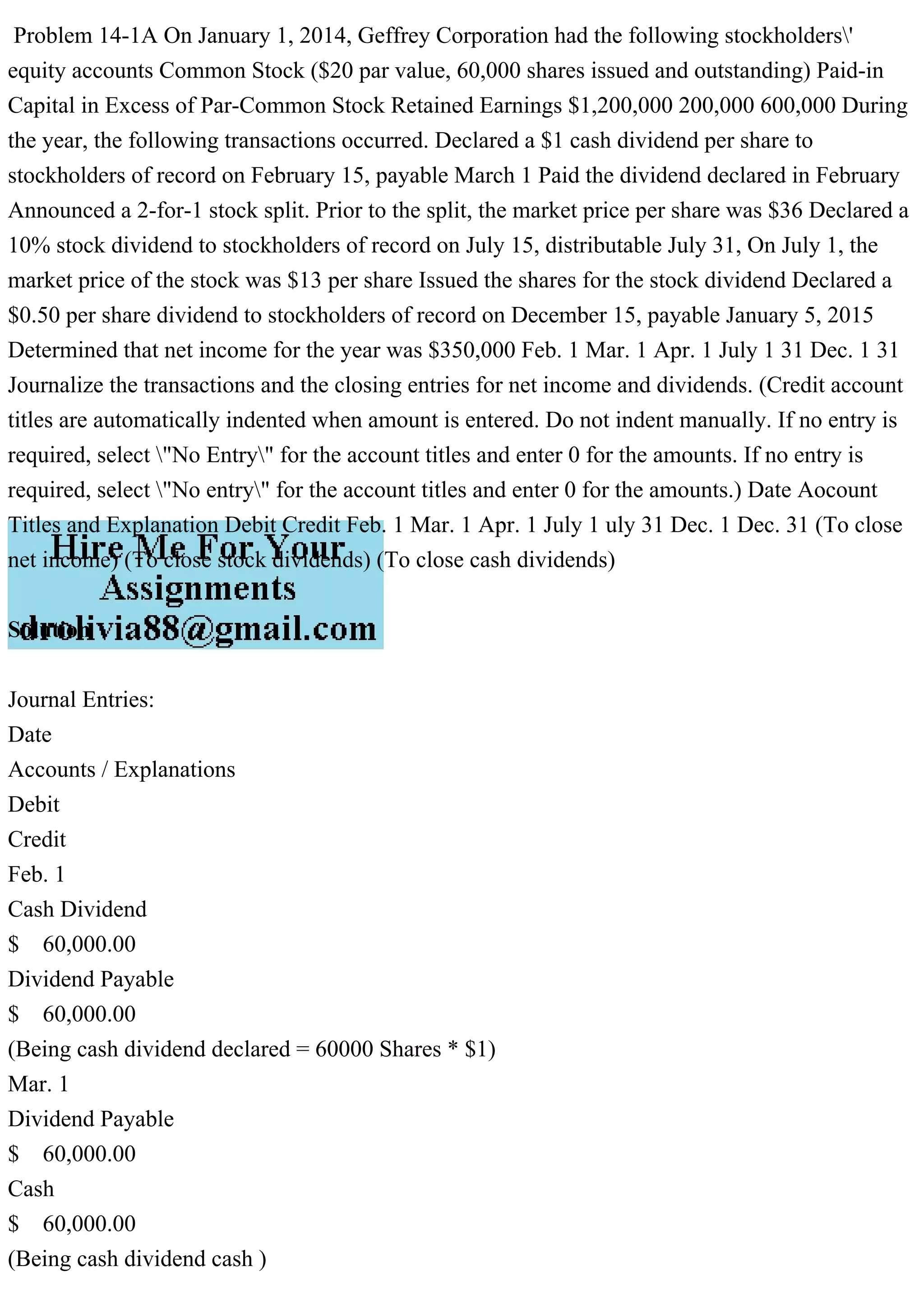 On January 1, 2014, Geffrey Corporation had significant stockholders' equity and declared multiple dividends and stock splits throughout the year, resulting in various journal entries. Key transactions included a $1 cash dividend, a 2-for-1 stock split, and a 10% stock dividend, impacting the number of shares and retained earnings. The year concluded with a net income of $350,000, requiring closing entries for income and dividends.