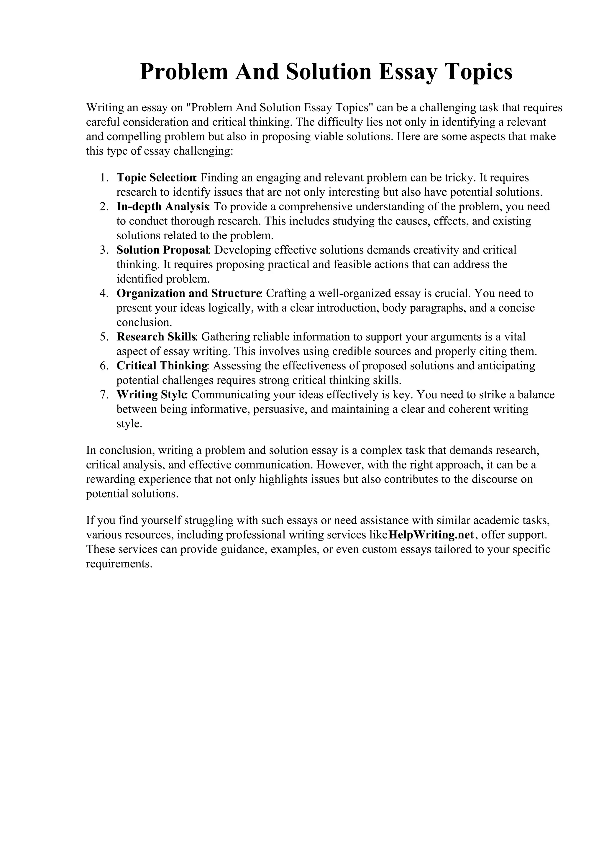 Writing a problem and solution essay entails selecting a relevant issue and proposing viable solutions, which can be complex due to various challenges such as topic selection, in-depth analysis, and effective communication. Essential skills include research, critical thinking, and structuring the essay properly. Helpful resources, like professional writing services, can assist those struggling with these essays.