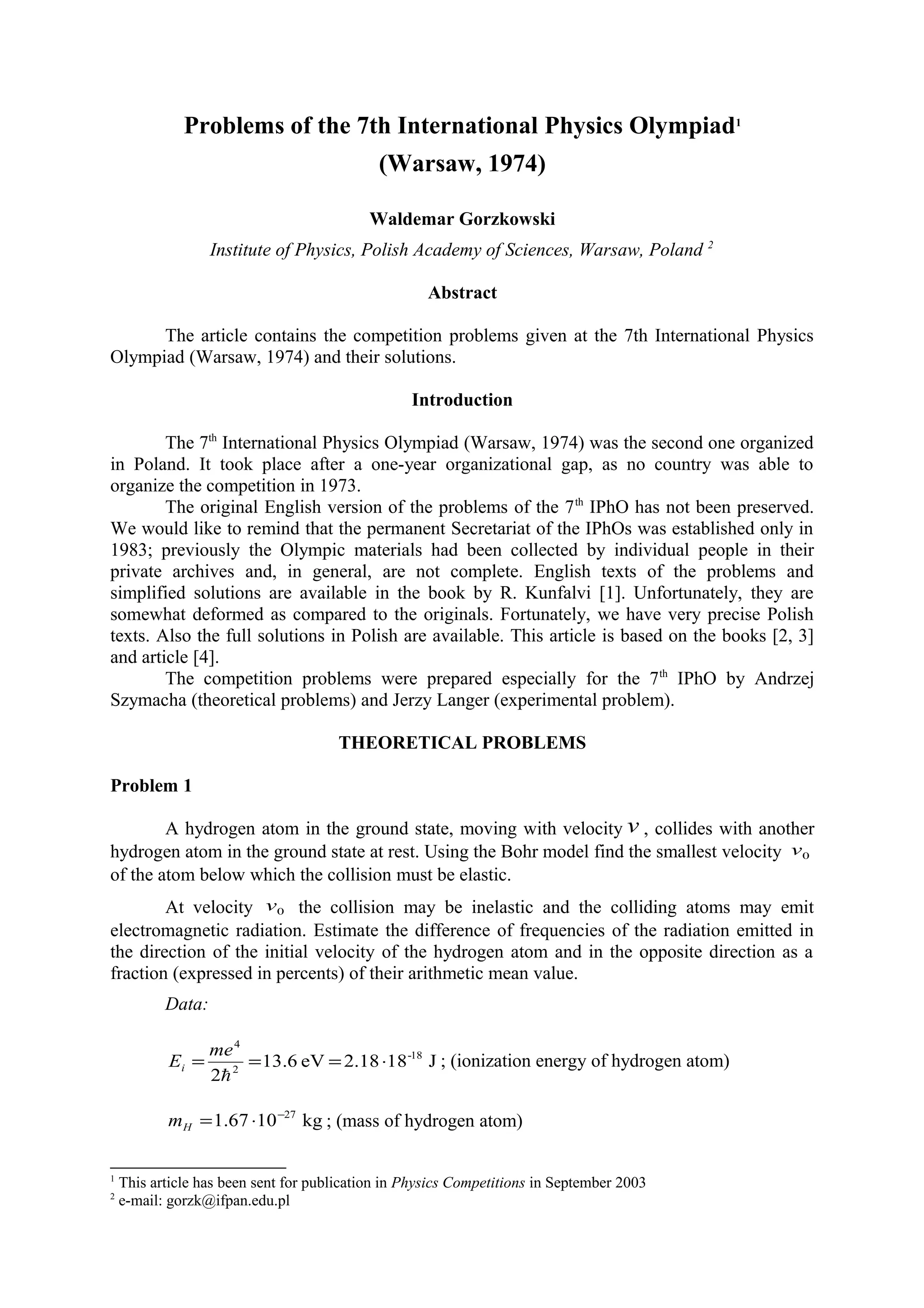 The document summarizes the problems from the 7th International Physics Olympiad held in 1974 in Warsaw, Poland. It includes two theoretical problems and their solutions. The first problem involves calculating the minimum velocity for an elastic collision between hydrogen atoms using the Bohr model. The second problem involves calculating refraction indices and trajectory of a light beam passing through a transparent plate with a refractive index that varies linearly with position.