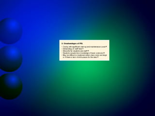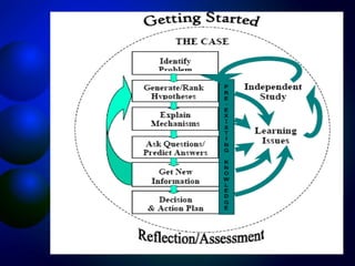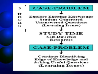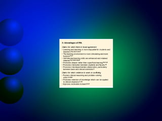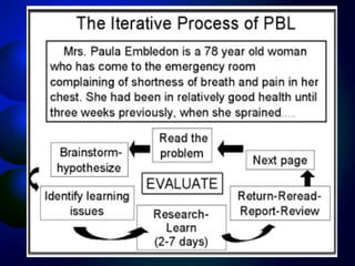 Problem-based learning (PBL) is an educational approach that uses real world problems as a context for students to learn about basic and clinical sciences. In PBL, students work in small groups facilitated by a tutor to discuss and solve clinical problems. This allows students to identify gaps in their knowledge and develop self-directed learning skills. PBL aims to develop an integrated, context-specific knowledge base and skills in critical thinking, self-directed learning, collaboration and communication. Some potential advantages of PBL include greater relevance to medical practice and improved knowledge retention and application.