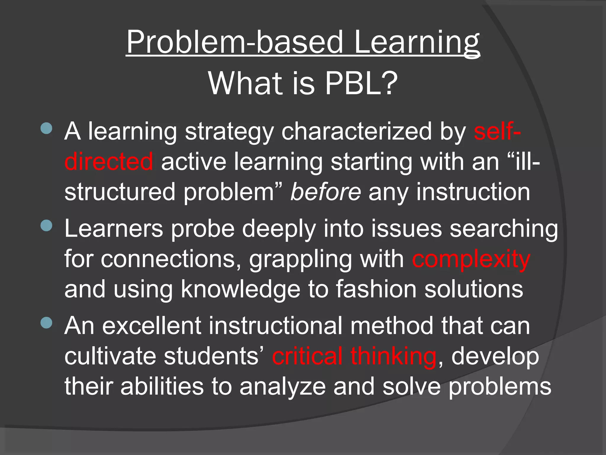 Problem-based learning (PBL) is an instructional strategy where students work in groups to solve an open-ended problem. It represents a shift from a teacher-centered approach where the teacher demonstrates and tests knowledge, to a student-centered approach where students discover knowledge through collaboration and hands-on problem solving. PBL cultivates critical thinking skills and student engagement. It allows students to develop creativity and independence by managing their own activities. PBL requires teachers to shift their goals from knowledge transmission to knowledge construction, and to focus on facilitating self-assessment over external evaluation.