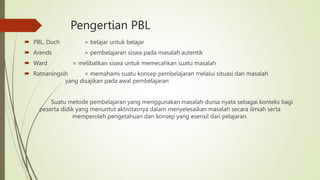 Pembelajaran Berbasis Masalah (PBL) adalah metode yang melibatkan siswa untuk menghadapi masalah nyata, sehingga mereka dapat belajar dan memahami konsep melalui situasi yang disajikan. Langkah-langkah PBL mencakup orientasi siswa pada masalah, serta pengorganisasian siswa untuk belajar dan mendefinisikan masalah. PBL bertujuan untuk mendorong aktivitas ilmiah dalam penyelesaian masalah dan penguasaan pengetahuan esensial.