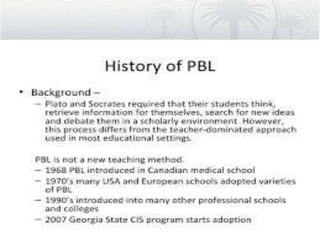 The document provides an overview of problem-based learning (PBL) in nursing education, highlighting its historical context, principles, and benefits. It emphasizes an active, student-centered approach to learning that encourages critical thinking, collaboration, and clinical reasoning. Additionally, it discusses the challenges and strategies involved in implementing PBL within educational curricula.