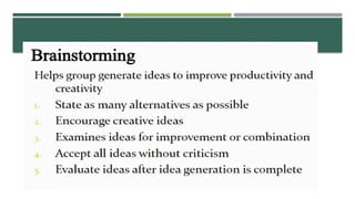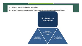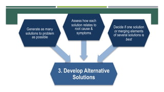 The document outlines a structured approach to problem identification and solving, emphasizing the importance of data collection from stakeholders and environmental scans. It details the steps involved in defining the problem, identifying root causes using methods like the 5 Whys, and developing actionable solutions through the Plan-Do-Check-Act (PDCA) methodology. Key takeaways include the necessity of understanding the problem's context and symptoms, and the importance of engaging relevant stakeholders throughout the process.