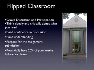This document outlines the expectations and tasks for a flipped classroom discussion on problem management and creativity. Students will participate in group discussions to think critically about the assigned readings and build their understanding and confidence. They will complete three tasks as a group: 1) describe the three most important aspects of the module and justify their choices, 2) identify the most difficult element of the module to apply and discuss it, and 3) pose a question to the full class that reflects their learning and implications of the theory. Afterward, students will self-assess their group discussion skills and what they learned.