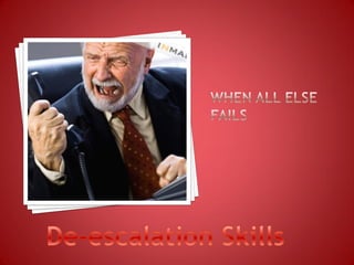 This document provides guidance on how to handle difficult customer situations. It recommends recognizing issues early, using de-escalation skills, and making interactions a perfect client experience. When customers are reluctant, accusatory or profane, the document suggests outlining a resolution strategy, bringing in a third party, and apologizing for any mistakes. Key steps include listening, apologizing, solving issues through education or appropriate parties, and thanking the customer. Behaviors to avoid include taking attitudes personally, ignoring emotions, focusing only on policy, and using inappropriate language. The document stresses being reliable, responsive, empathetic and competent in all client interactions.