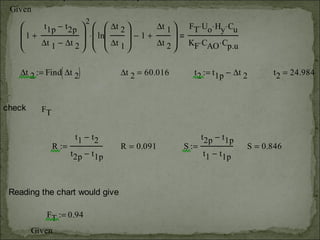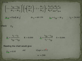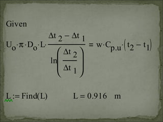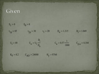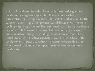 An air cooler uses steel pipes within a shell to cool 200 kg/hr of air from 85°C to 30°C. The air flows through tubes while cooling water flows through the shell of a 1-shell, 2-tube pass heat exchanger. Given heat transfer coefficients and costs, the optimum exit temperature of the cooling water and optimum length of tubes need to be calculated to most efficiently cool the air.
