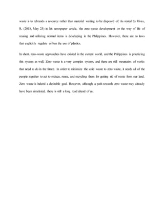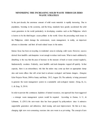 The document discusses the escalating solid waste crisis in the Philippines, driven by population growth and economic development, highlighting the need for sustainable waste management strategies. Despite efforts focused on recycling, the increasing waste generation poses significant environmental and health risks, necessitating the adoption of a zero-waste approach. While there is a growing interest in zero waste practices, challenges remain in effectively transitioning to this model, and collaborative efforts are essential for minimizing waste.