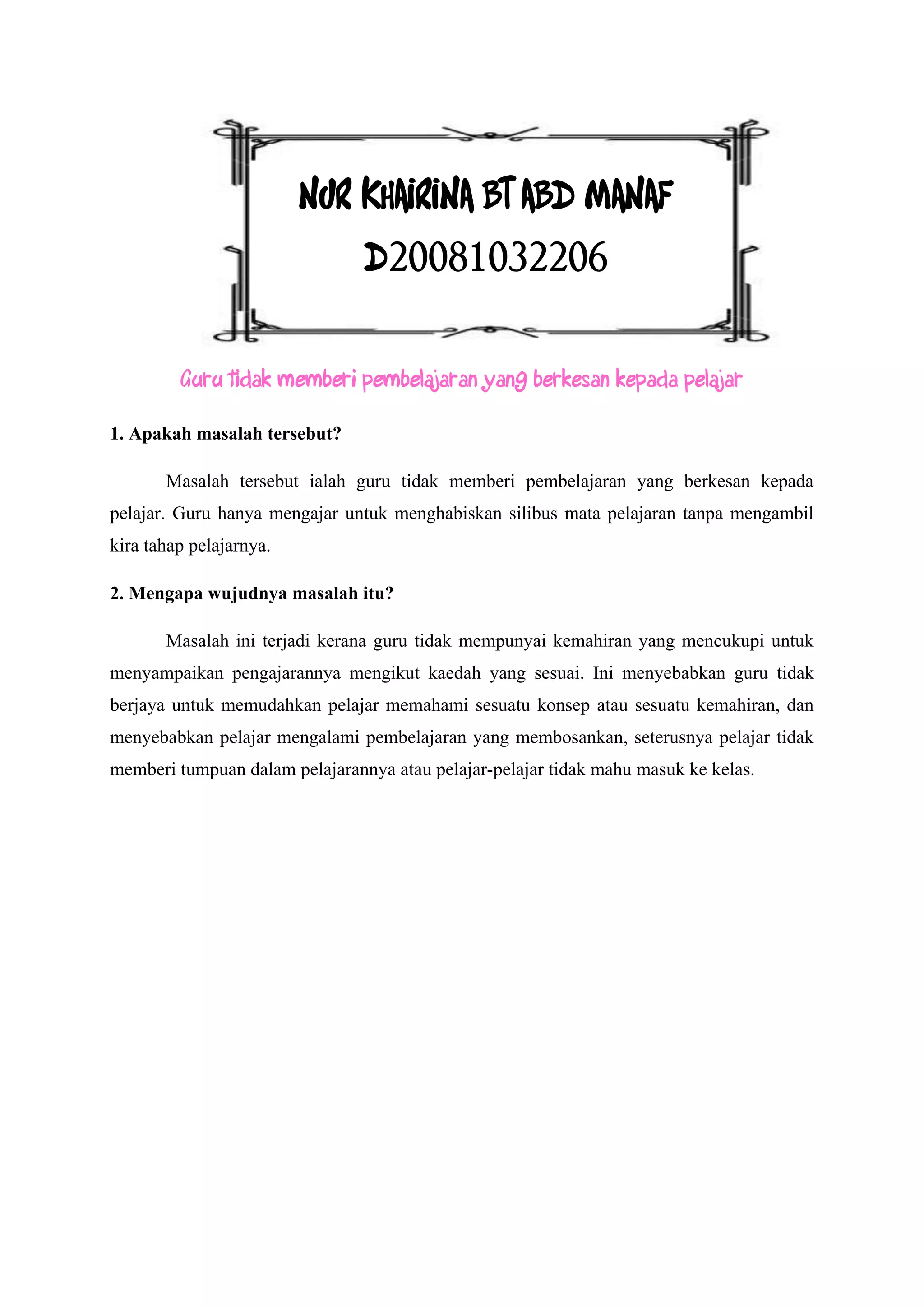 Masalah yang dihadapi guru dalam mencapai pengajaran yang berkesan adalah kualiti pengajaran yang rendah akibat ketiadaan persediaan yang mencukupi sebelum pengajaran, penggunaan kaedah pengajaran yang kurang bervariasi semasa proses pengajaran dan pembelajaran, serta ketiadaan refleksi terhadap proses pengajaran dan pembelajaran selepasnya.