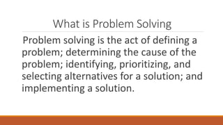 Problem solving involves four main steps: 1) defining the problem, 2) generating alternative solutions, 3) evaluating and selecting an alternative, and 4) implementing and following up on the solution. The document outlines the characteristics of each step, such as differentiating facts from opinions, brainstorming alternatives, evaluating options relative to goals, and establishing ongoing monitoring of the selected solution. The overall goal is to thoroughly understand the problem, consider various potential solutions, choose the best option, and ensure follow through.