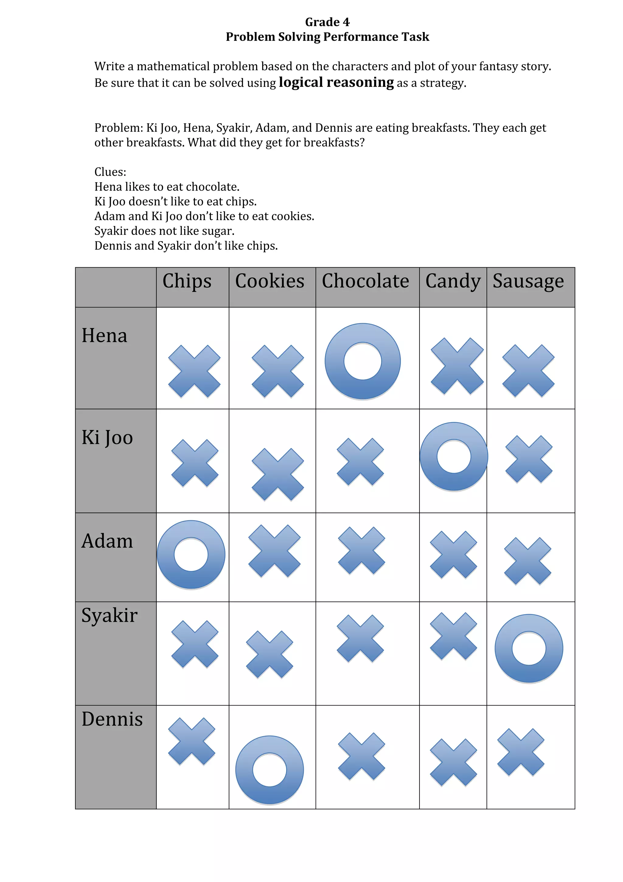 The document provides a grade 4 problem solving performance task that involves writing a mathematical problem based on a fantasy story with characters. It includes a sample problem about characters Ki Joo, Hena, Syakir, Adam, and Dennis eating different breakfast items. Clues are provided about what each character likes and dislikes to help solve what breakfast each person got.
