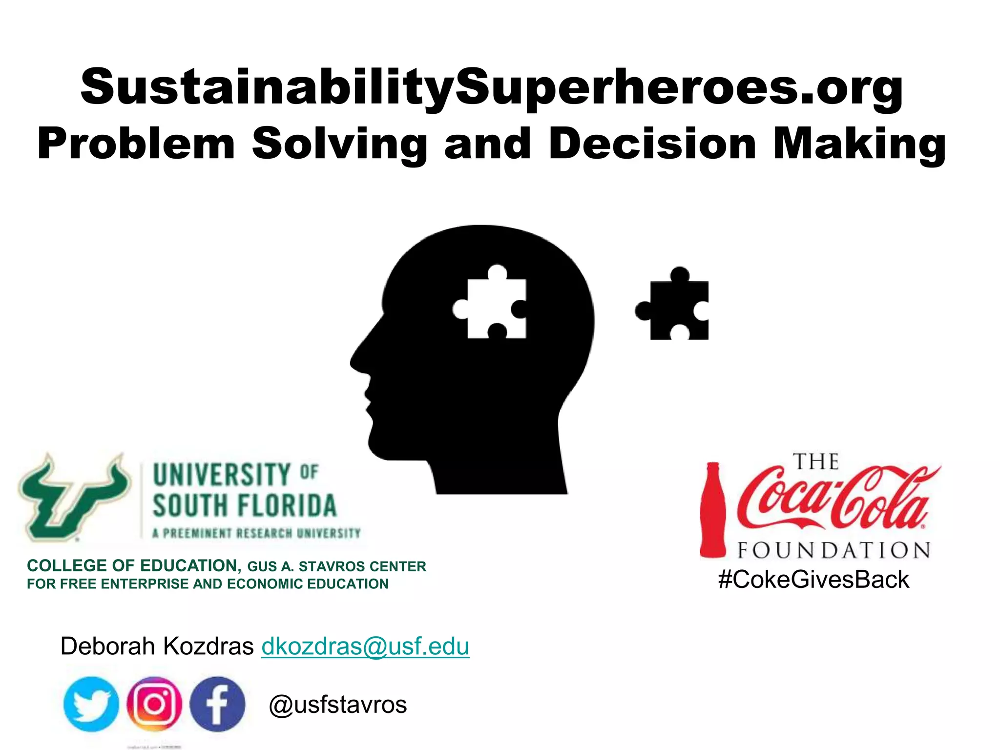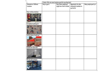 This document discusses sustainability and problem solving. It defines sustainable development as meeting present needs without compromising future generations' ability to meet their own needs. It discusses the triple bottom line of sustainability and analyzing problems by finding root causes, anticipating future problems, and assessing situations. As an example, it outlines analyzing where to place a new recycling bin by considering alternatives and criteria to make the decision. It also discusses potential problems with foil and plastic food packets touted as reducing landfill waste.